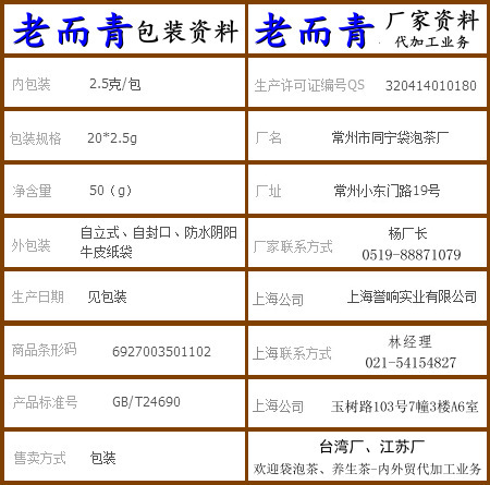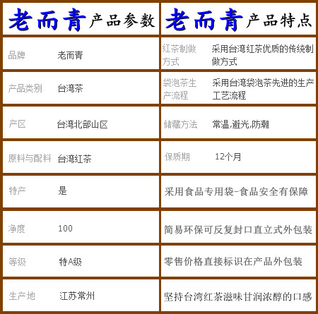 红茶老而青红茶袋泡茶净重50克坚持台湾红茶一贯独特风味与口感. 老而青红茶袋泡茶坚持采用台湾红茶优质传统制茶过程和台湾袋泡茶先进的生产工艺流程,维持台湾红茶一贯的独特风味和台湾袋泡茶高品质高质量的食品安全要求,让国内消费者买的放心、吃的安心.