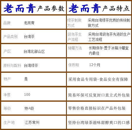 老而青绿茶袋泡茶坚持采用台湾绿茶优质的传统制做方式和台湾袋泡茶先进的生产工艺流程,维持台湾绿茶一贯的独特风味和台湾袋泡茶高品质高质量的食品安全要求,让国内消费者买的放心、吃的安心.