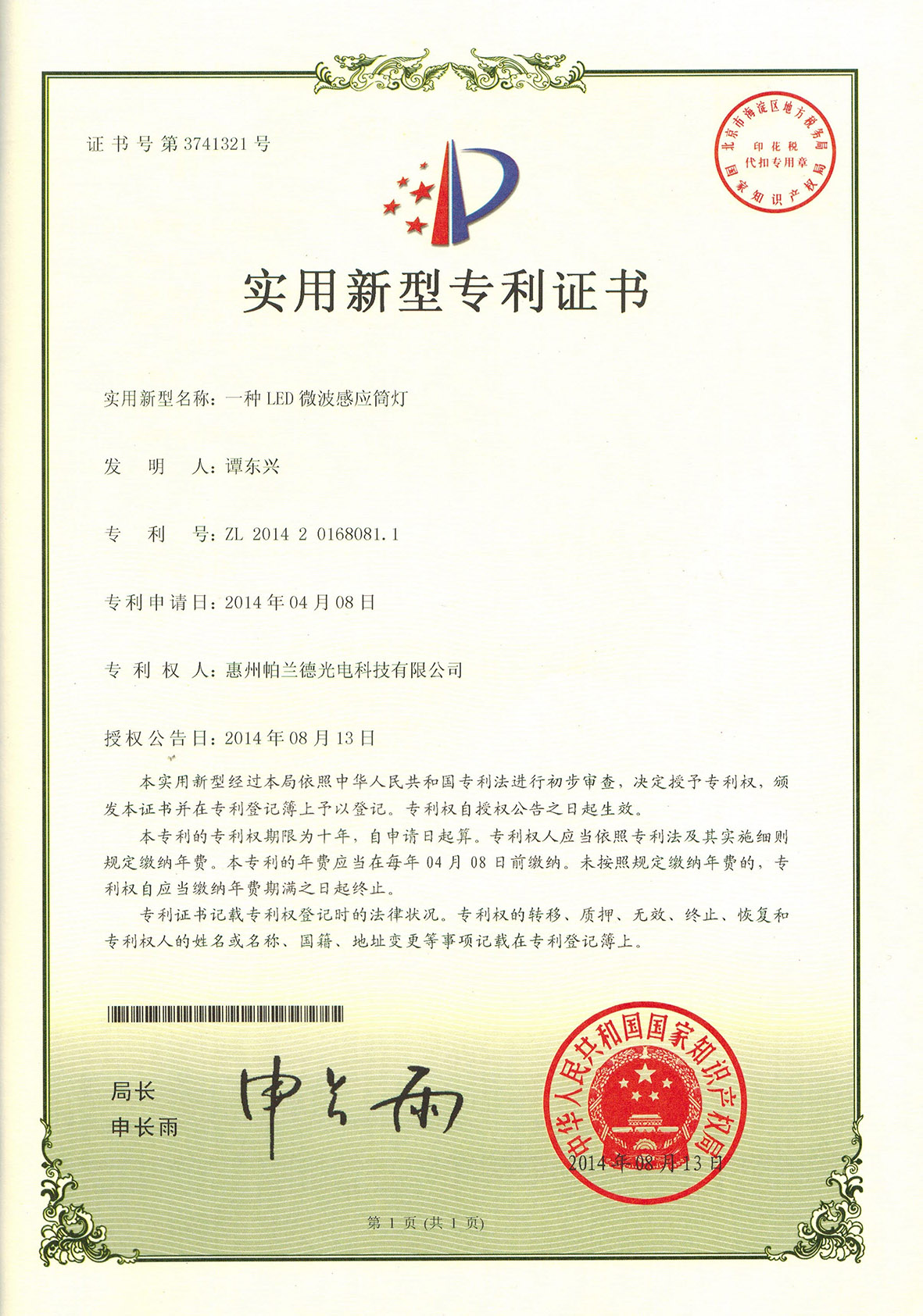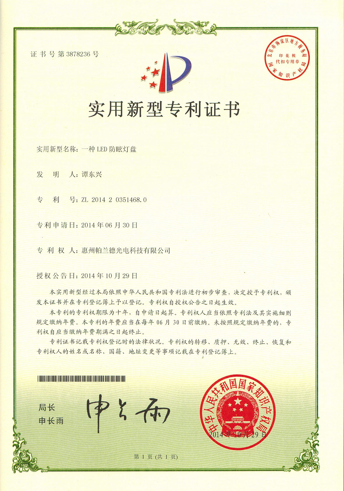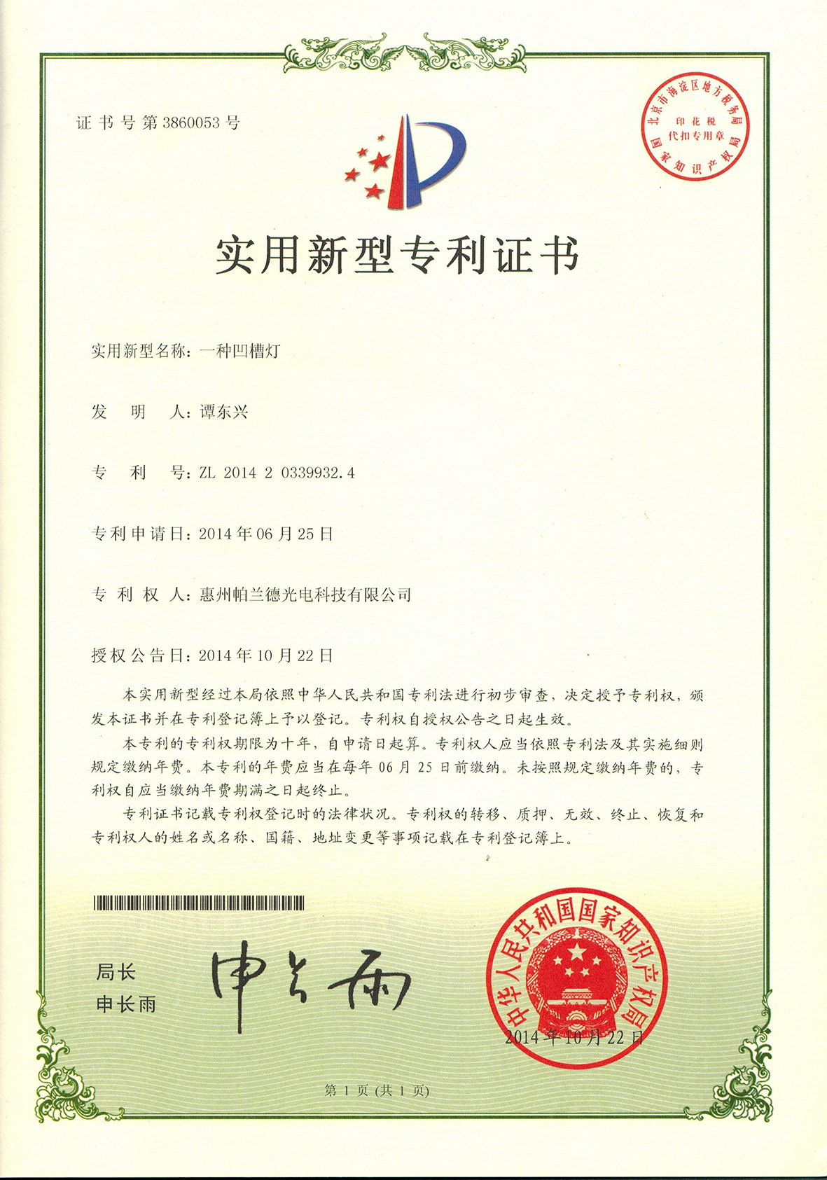 近日,公司关于“LED创新灯具”的8项实用新型专利申请获得国家知识产权局的审批通过,在收到证书的瞬间,我们更加坚定了“帕兰德Plamd”的产品和品牌定位,同时这些专利的成功申请也让我们向更加科技化的LED品牌之路又迈进了一步。