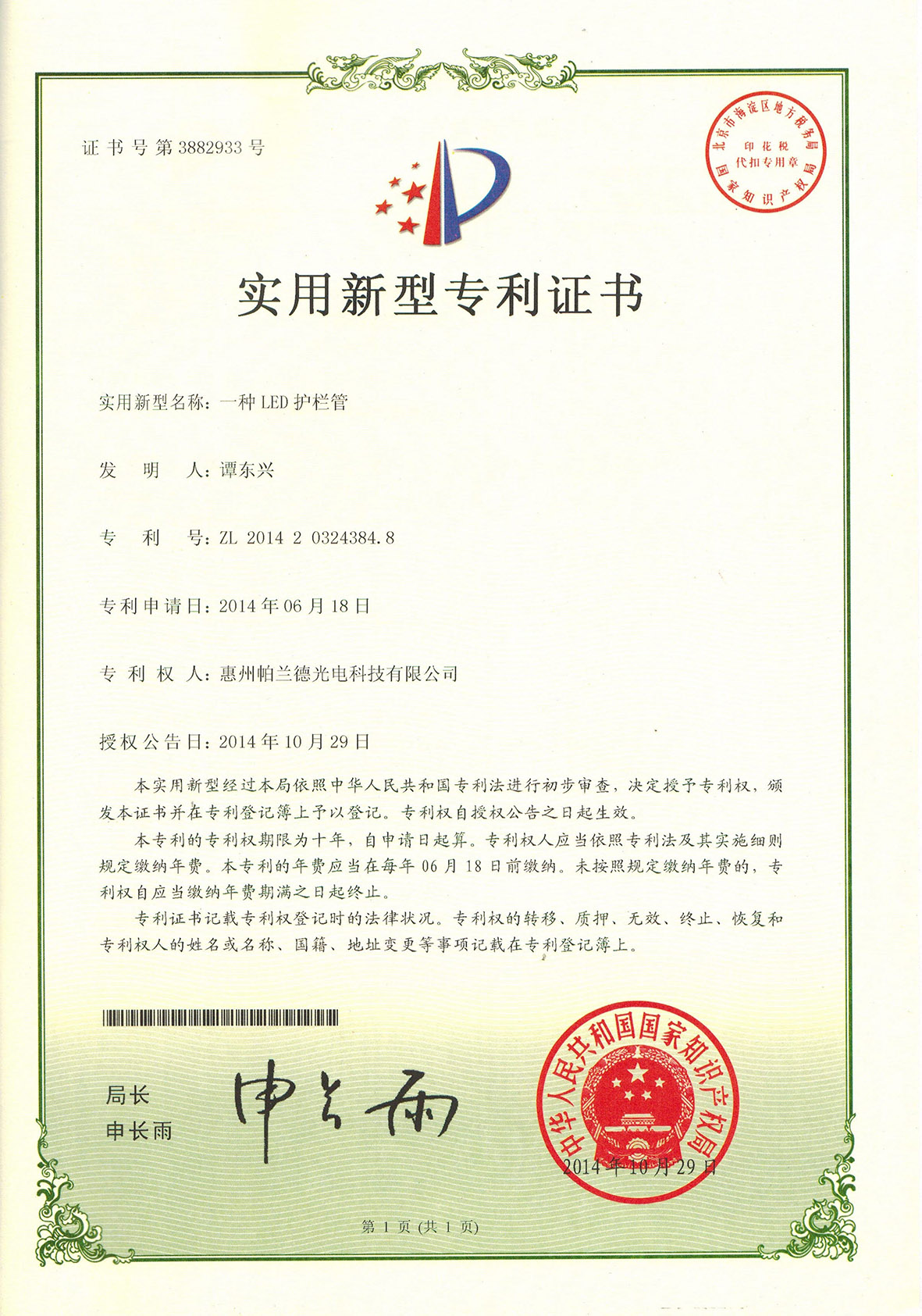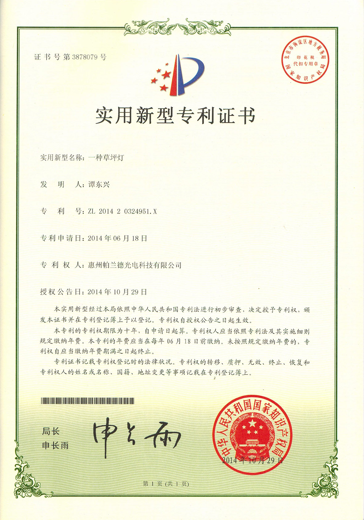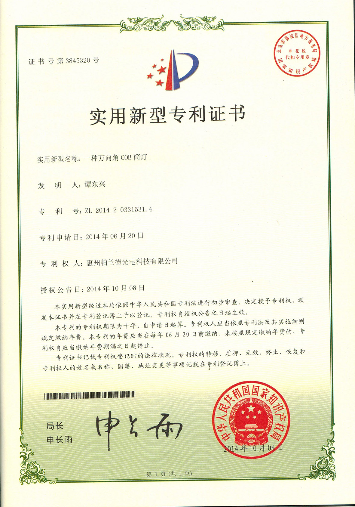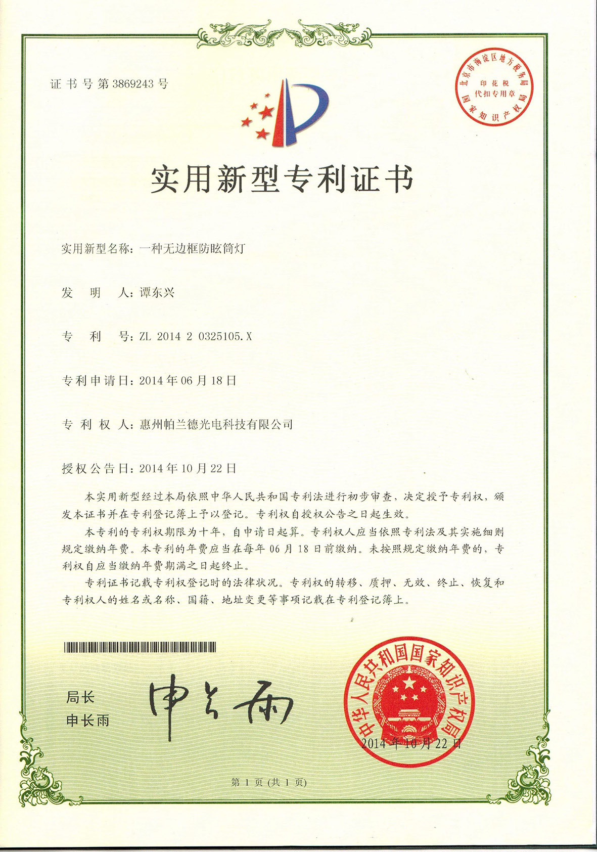 近日,公司关于“LED创新灯具”的8项实用新型专利申请获得国家知识产权局的审批通过,在收到证书的瞬间,我们更加坚定了“帕兰德Plamd”的产品和品牌定位,同时这些专利的成功申请也让我们向更加科技化的LED品牌之路又迈进了一步。