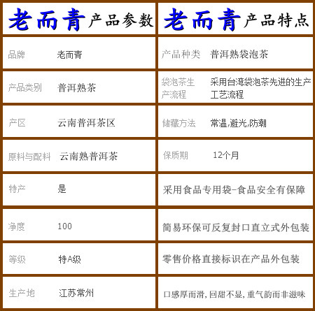 老而青普洱茶袋泡茶坚持采用优质云南普洱熟茶(云南大叶种晒青毛茶为主要原料)和台湾袋泡茶先进的生产工艺流程,维持云南普洱熟茶一贯的独特风味和台湾袋泡茶高品质高质量的食品安全要求,让国内消费者买的放心、吃的安心.