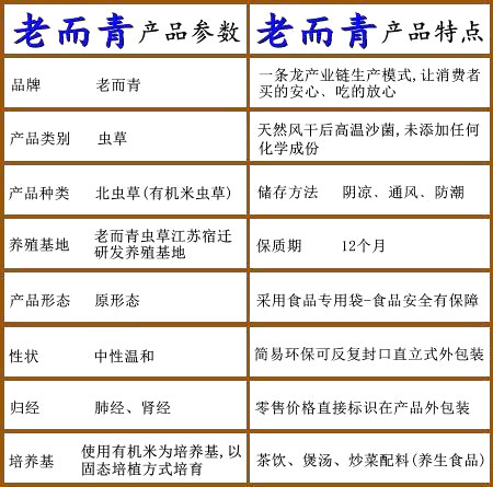 老而青有机米虫草净重20克适合于茶饮、煲汤、炒菜. 一条龙产业链生产模式,让消费者买的安心﹑吃的放心. 【老而青虫草宿迁养殖研发基地】的菌株来源是引种台湾虫草Cordyceps formosana Kobayasi & Shimizu(台湾原生种野生天然虫草),台湾农业科技研究人员利用其[被毛孢属冬虫夏草]无性型的优势,采用台湾先进的菌丝体分离方法与人工培育的方式,根据江苏宿迁的地理与气候特性,在老而青虫草宿迁养殖研发基地经过多年的培育实验与技术改良,培育出更适合当地人工养殖的北虫草新品种.
