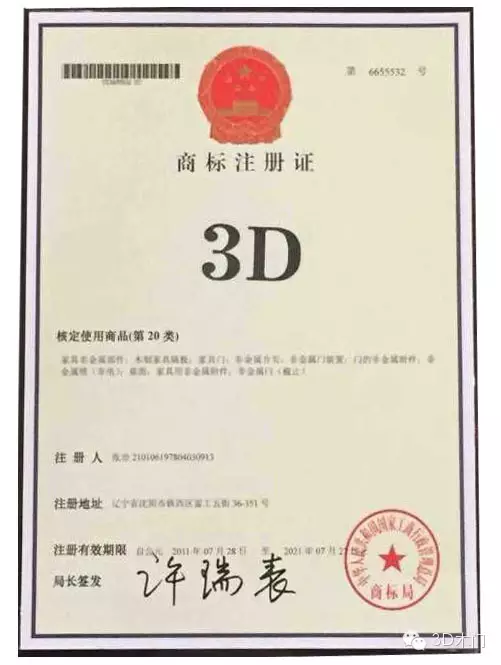 一,”3D”为我司注册商标,我司已在11种品类注册90余个“3D”商标,涵盖家具、木门、金属门、地板、木窗、板材、五金、楼梯、玻璃等(其中我司拥有的第20类“3D”商标为家具类,国家商标局规定家具类含橱柜、衣柜、床、沙发等300多种家居产品)